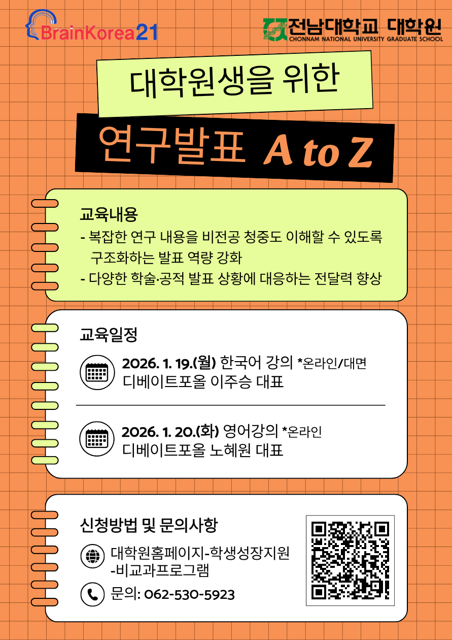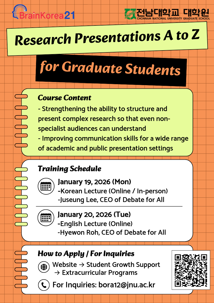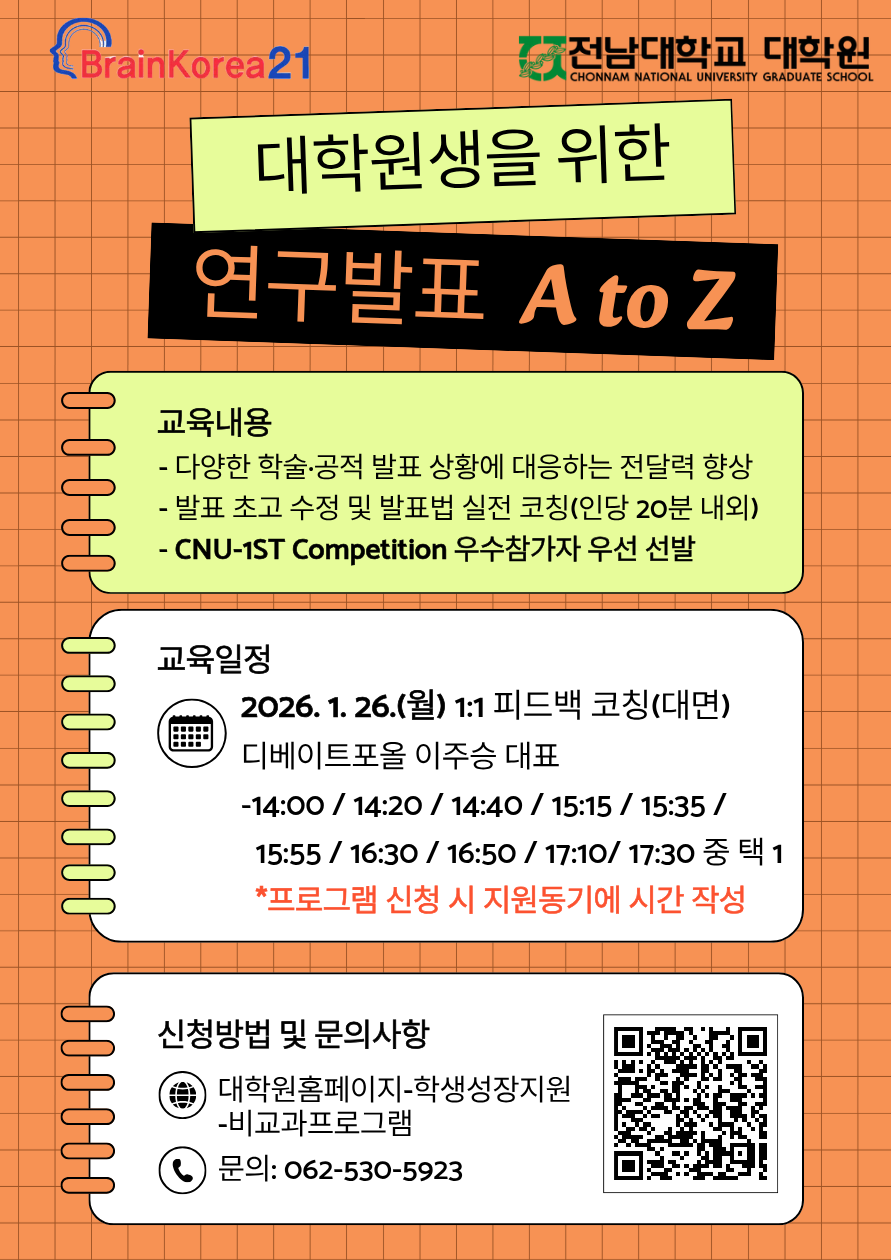 학술대회 발표를 준비하는 대학원생과 초보 연구자의 발표 자료 기획 및 구성, 연구 결과 전달 능력 향상을 위하여 다음과 같이 「대학원생을 위한 연구 발표 A to Z」 특강 및 1:1 피드백 코칭을 실시하오니 교내 대학원생과 학내 구성원에게 적극 홍보하여 주시기 바랍니다.