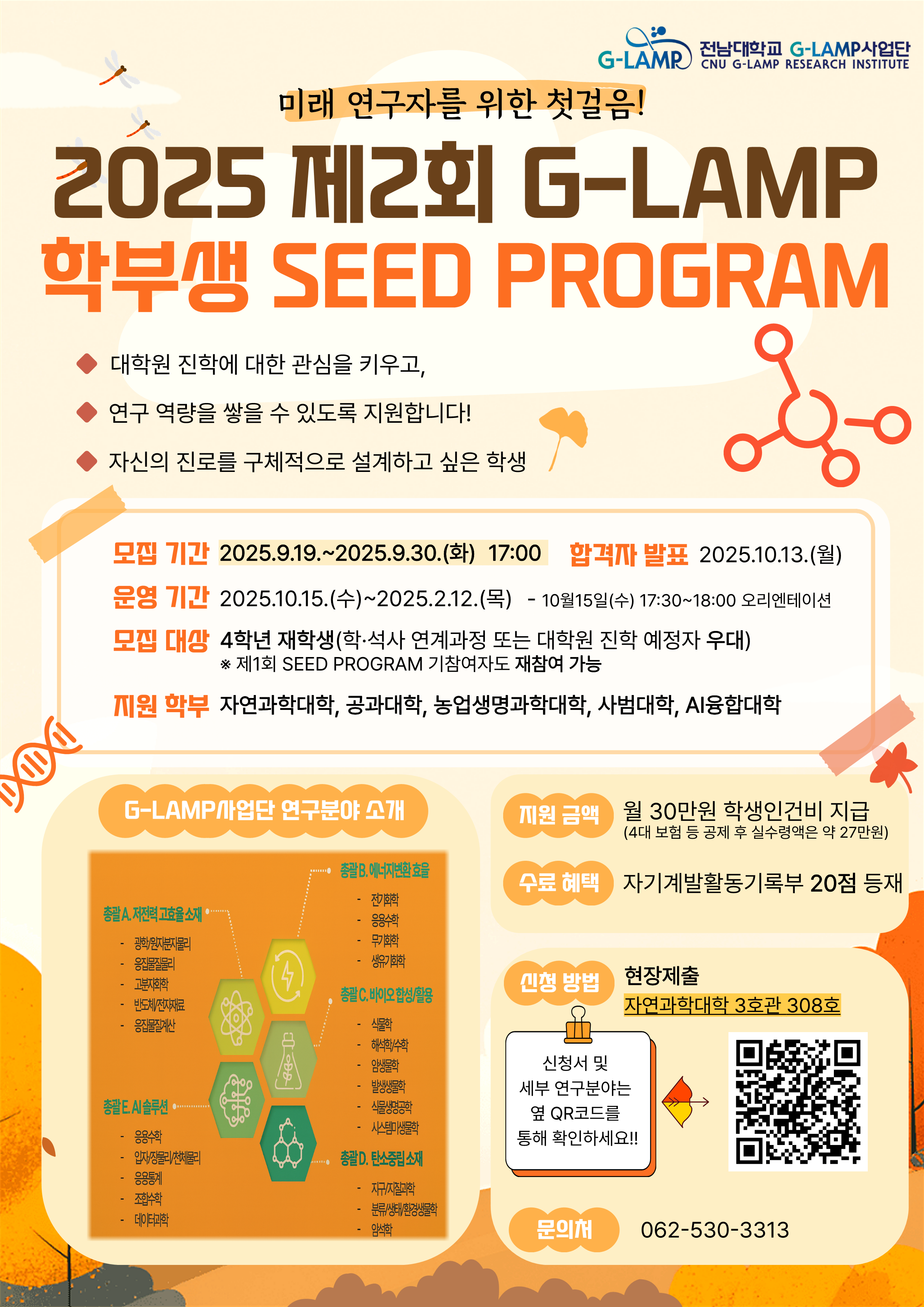 G-램프(LAMP)사업단에서 자연계열 학부생의 글로컬 연구역량을 향상하고자 「2025 제2회CNU G-LAMP SEED PROGRAM」를 아래와 같이 운영하오니, 관심있는 학부생의 많은 참여 바랍니다.